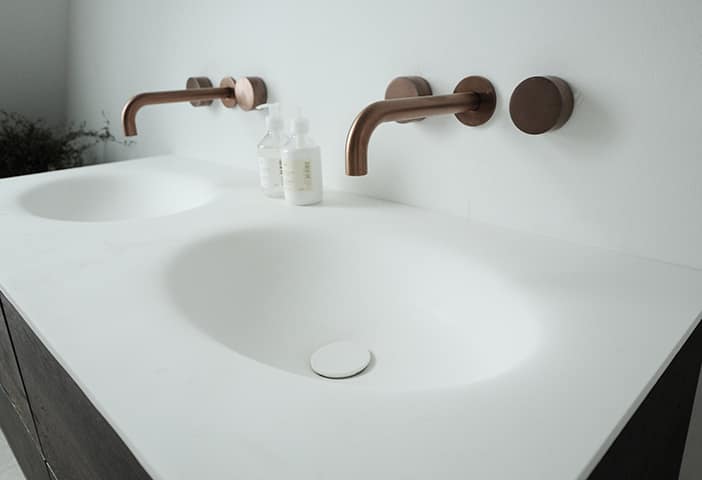 Corian / Corian er et stærkt og holdbart materiale, som er modstandsdygtigt over for ridser, pletter og stød. Det er ikke et porøst materiale, hvilket betyder, at det ikke absorberer væske og er modstandsdygtigt over for bakterier og skimmel, hvilket gør det særligt velegnet til badeværelses- og køkkenmøbler. Corian kan formes efter behov, hvilket giver mulighed for utallige designløsninger til vask og bordplade.