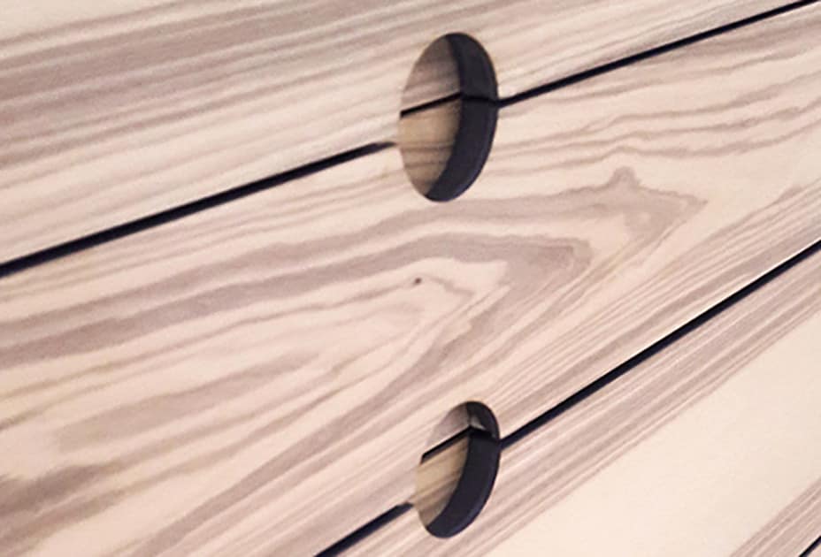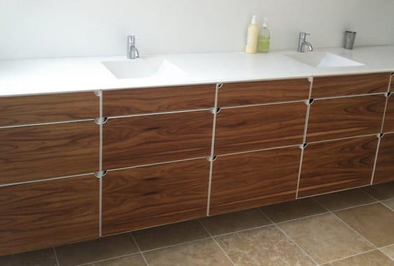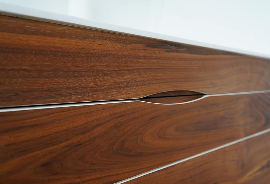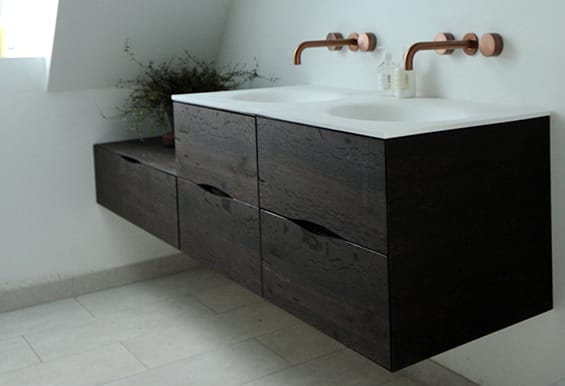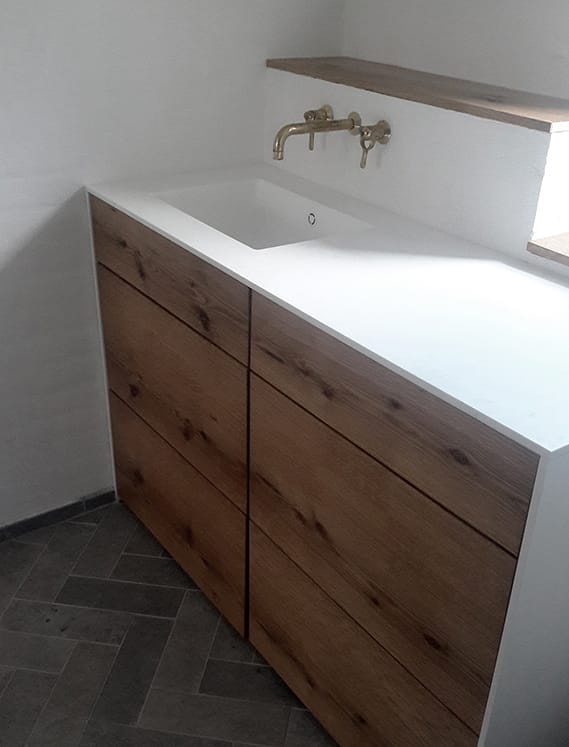 På snedkeriet er vi specialiserede i omhyggeligt finérarbejde og har lang erfaring med at arbejde med træ, og derfor kan vi skabe mange specielle mønstre af træets åretegninger. Vi har over 50 træsorter på lager, og du er velkommen til at komme ud til snedkeriet og vælge netop det træstykke, som skal bruges til dit møbel. Vi har sparet forhandlerledet væk, og du får derfor et individuelt designet badeværelsesmøbel af høj kvalitet til en fair pris.
