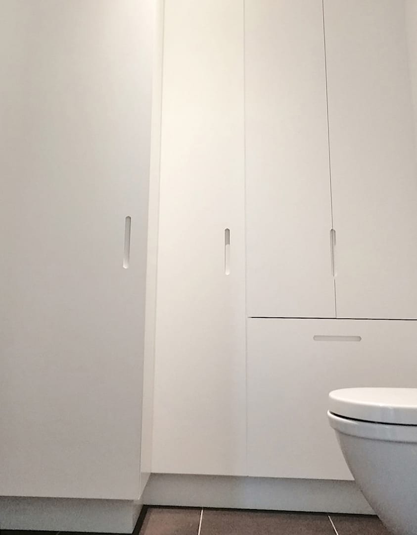 Vi fremstiller specialdesignede badeværelsesmøbler på mål, der er skabt specifikt til dit badeværelse baseret på dine behov, præferencer og rummets dimensioner. Møblerne designes med fokus på funktionalitet, æstetik og optimal udnyttelse af pladsen i dit badeværelse. Du får mulighed for at tilpasse hver eneste detalje efter dine ønsker, hvilket gør det muligt at skabe et personligt badeværelsesmiljø, der passer perfekt til din smag og dit hjem, eksempelvis kan der fremstilles et skabsarrangement, der passer ind i et hjørne eller langs en skråvæg, og som udnytter pladsen optimalt.