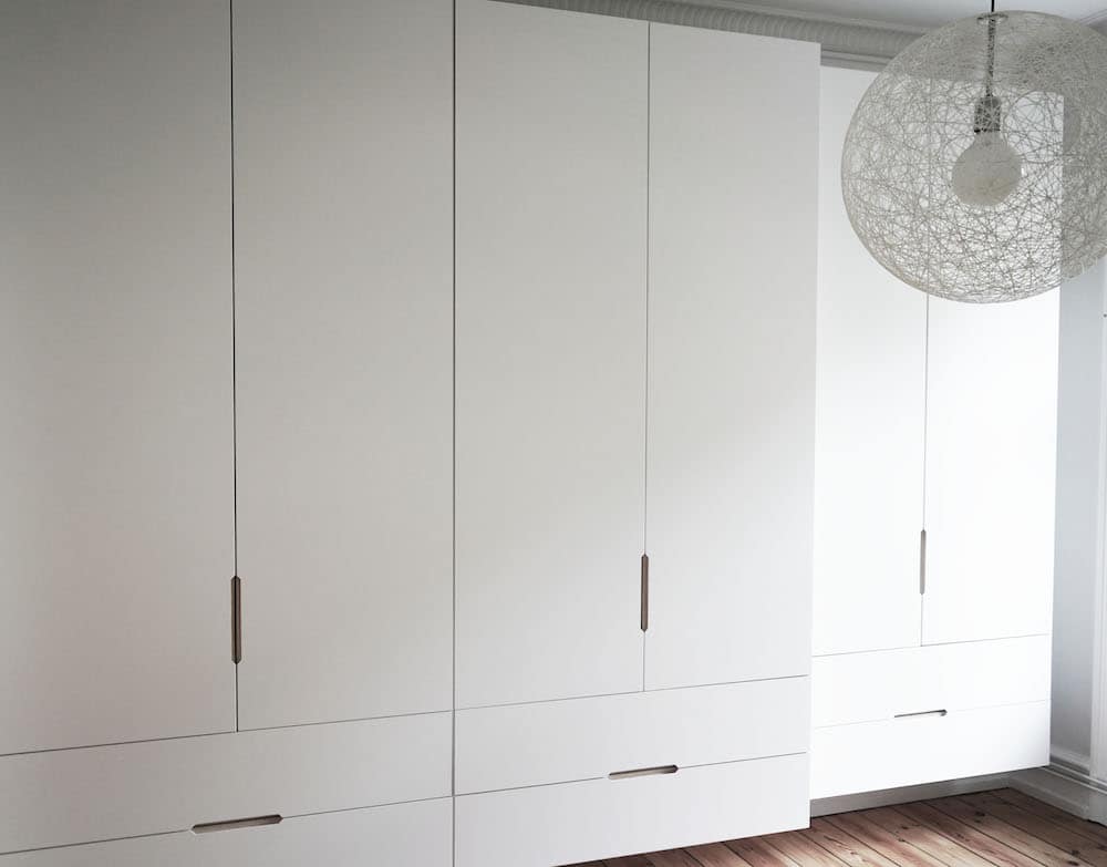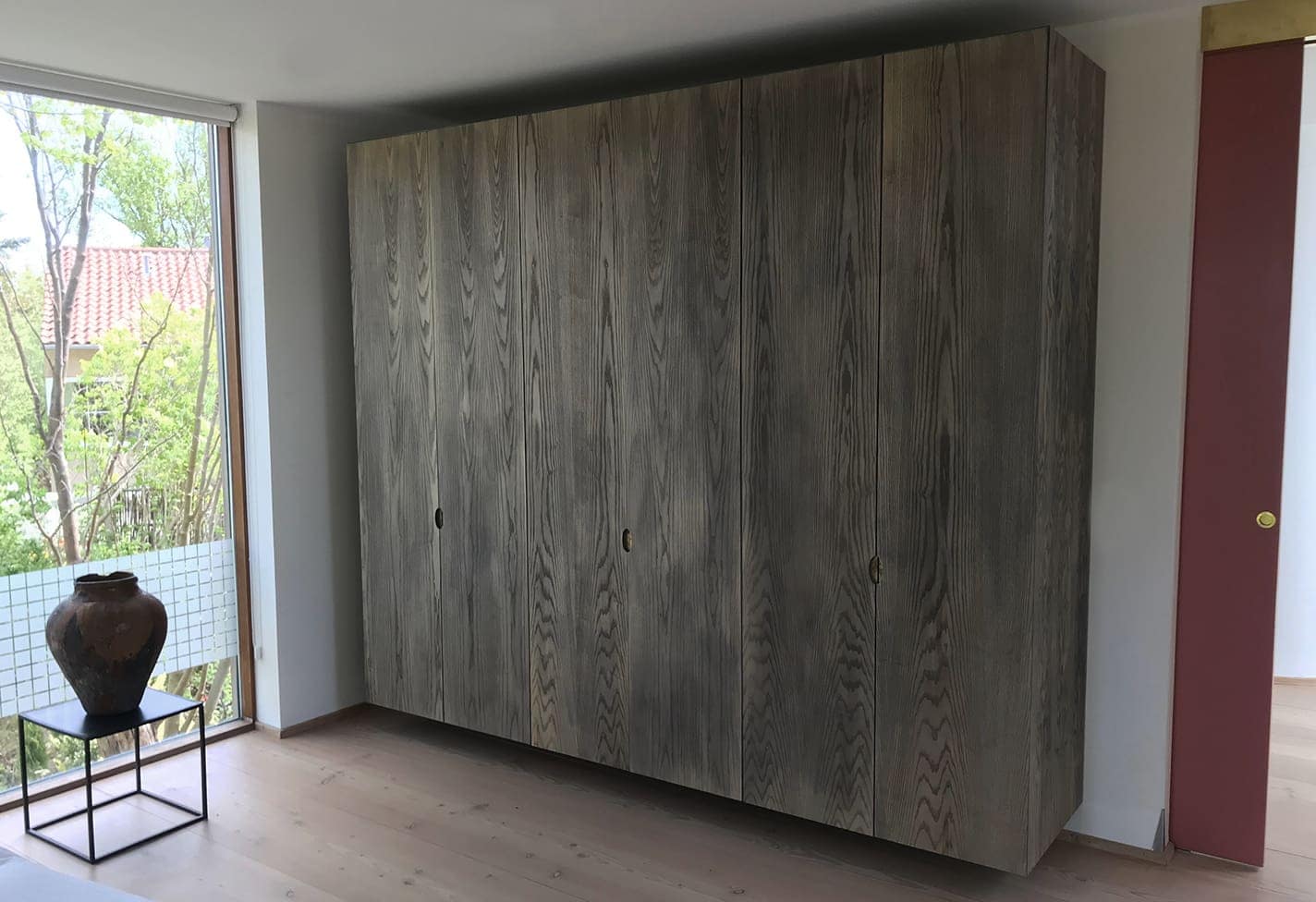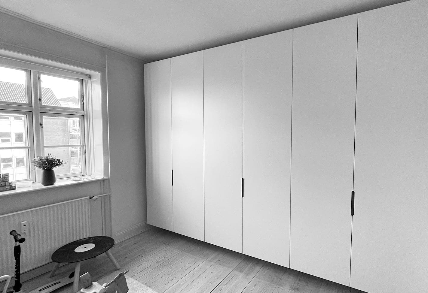 Vi designer og fremstiller garderobeskabe på mål i alle dybder, højder og bredder, og de monteres af vores egne snedkere. Møbeldesigner og snedker Jesper Holm går til opgaven med stor omtanke for garderobeskabets æstetiske udtryk i rummet, for at sikre, at det færdige produkt har en høj funktionalitet og er skræddersyet til det hjem, det skal stå i. Hele garderobeskabet produceres på vores snedkeri i Ishøj via en kombination af traditionelle snedkermetoder og moderne produktion.