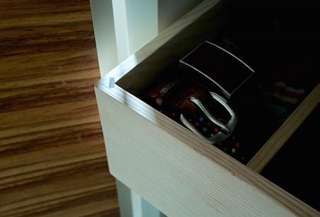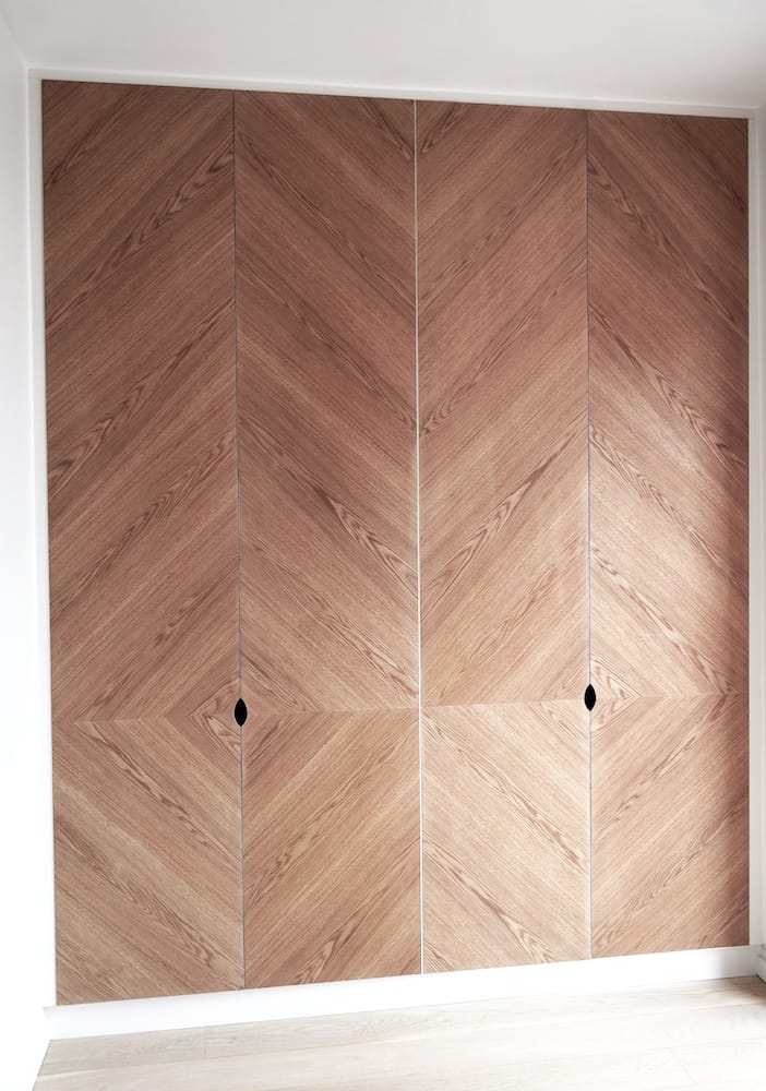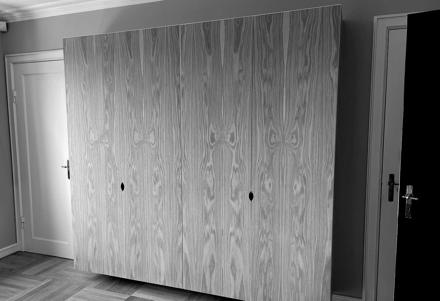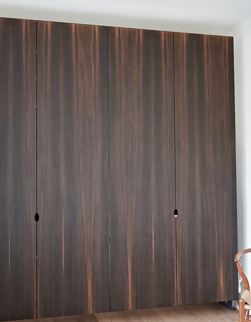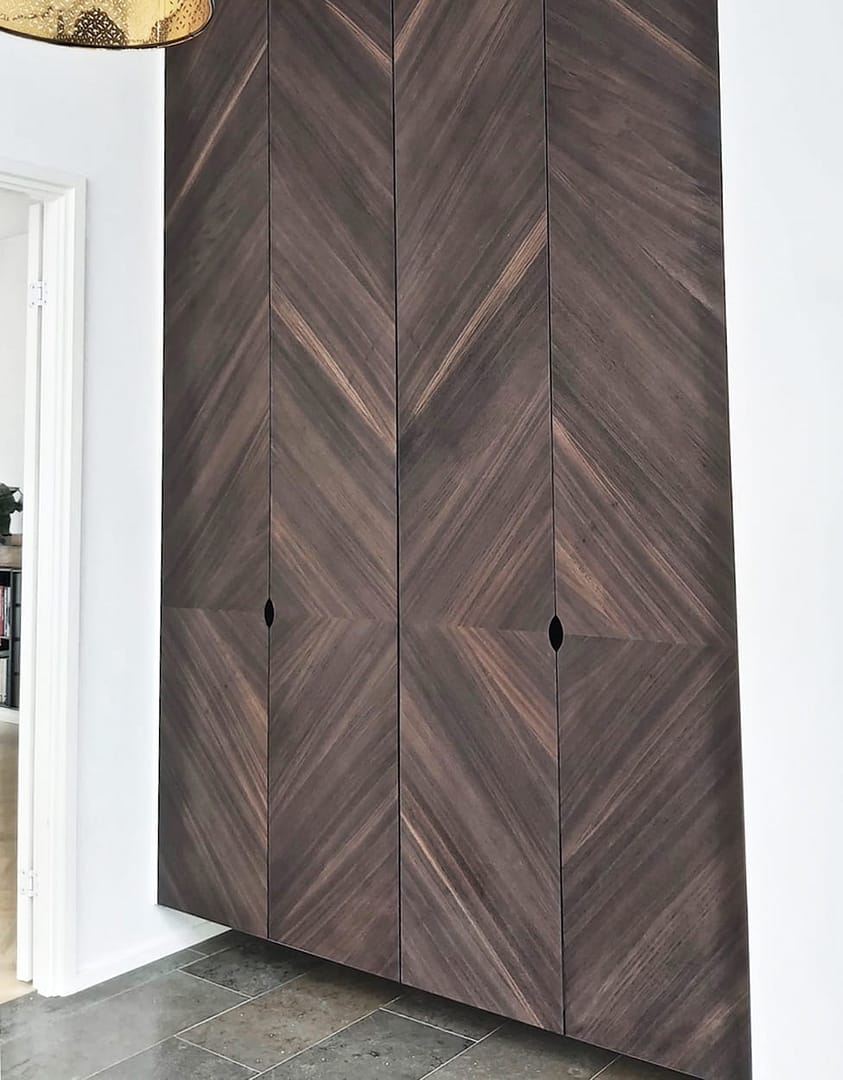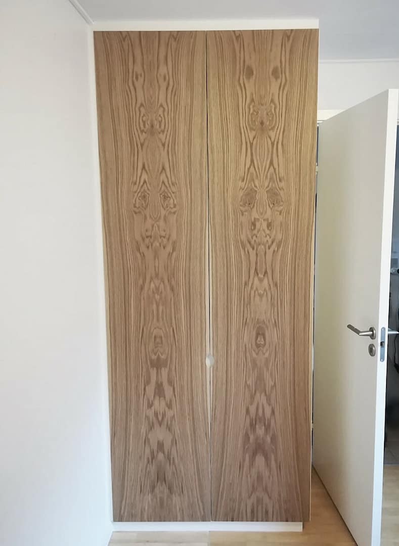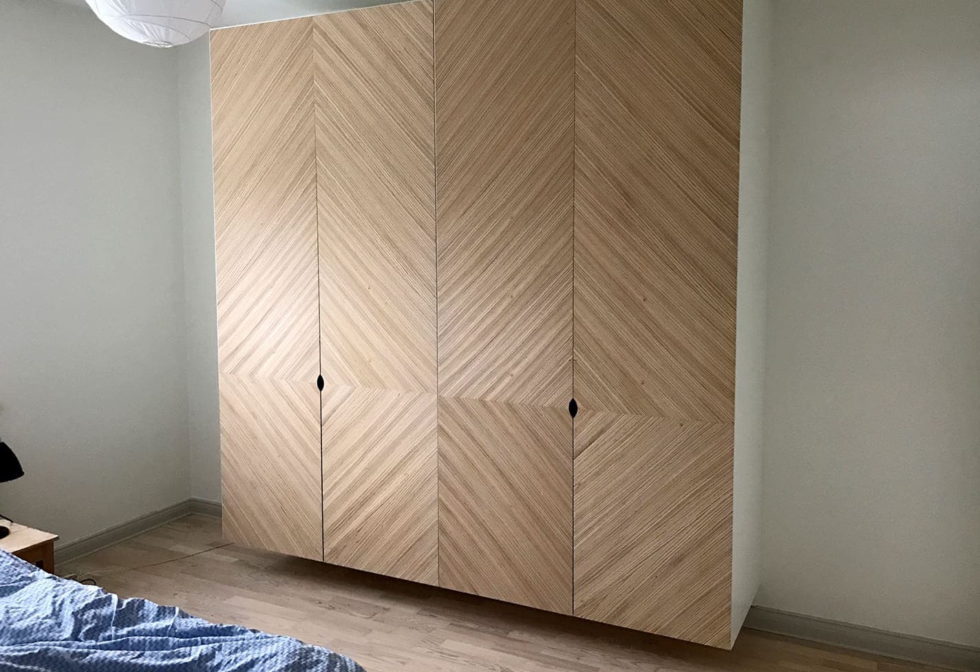 Alle vores garderobeskabe fremstilles af 22 mm HDF-plader af højeste kvalitet samt de bedste beslag og soft-close hængsler, hvilket gør, at skabene er lavet til at holde livslangt. På snedkeriet specialiserer vi os i omhyggeligt finérarbejde, og derfor kan der skabes mange specielle mønstre af træets åretegninger på dit garderobeskab. Vi har et bredt udvalg af over 50 træsorter, hvor du får mulighed for at udvælge det træstykke, som skal bruges til dit garderobeskab. Hos os er forhandlerledet sparet væk, og dette betyder, at du får et individuelt designet snedkergarderobeskab af høj kvalitet til en fair pris.
