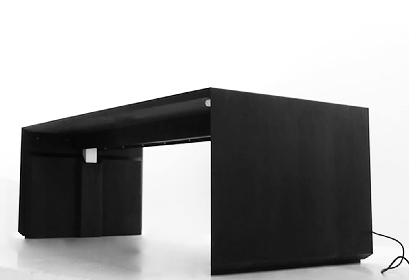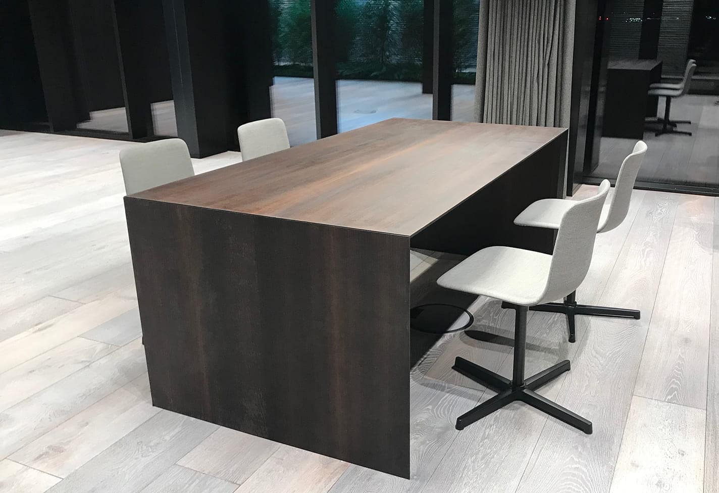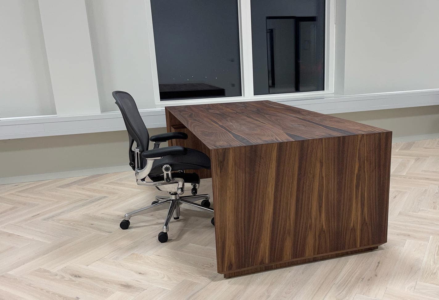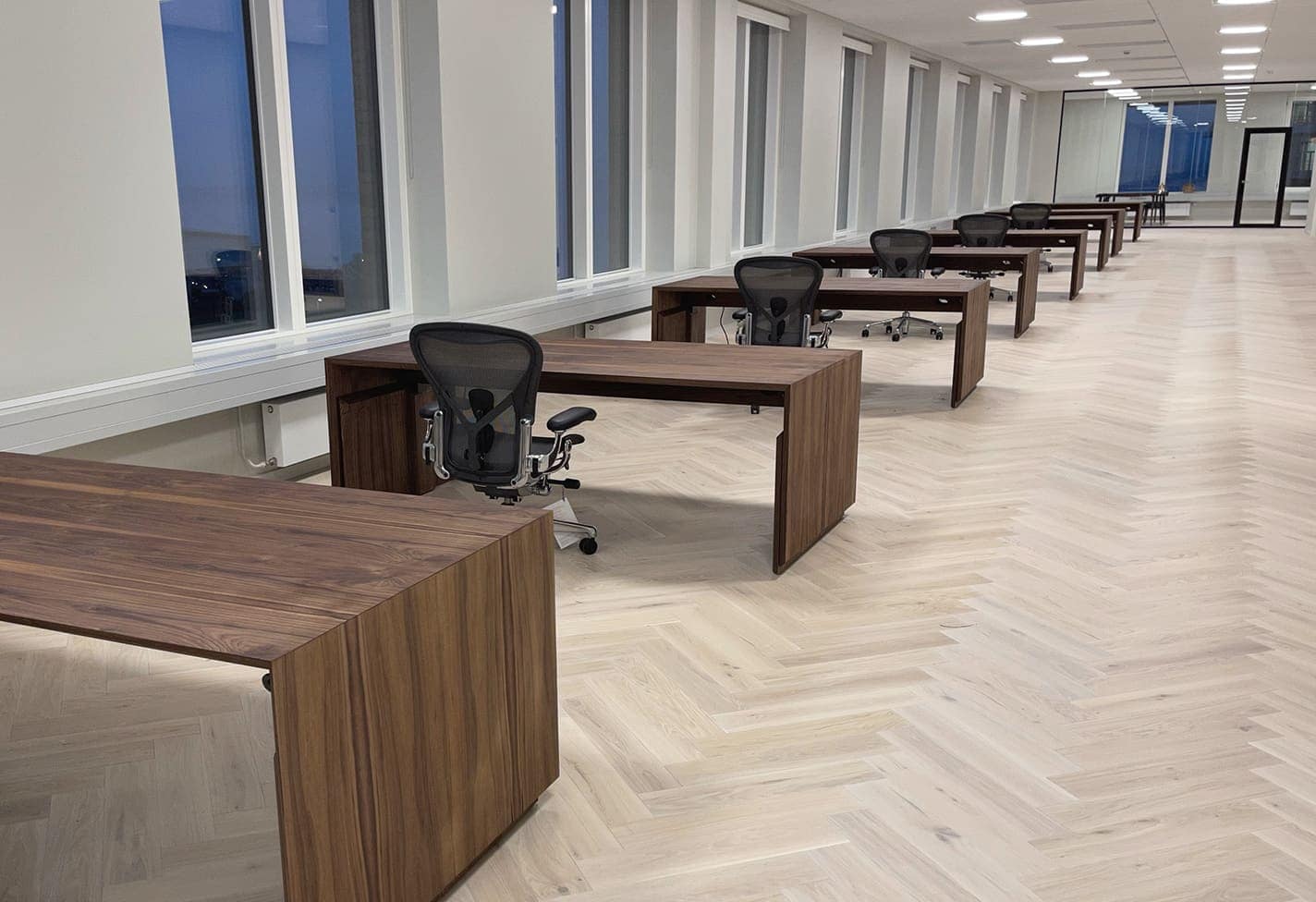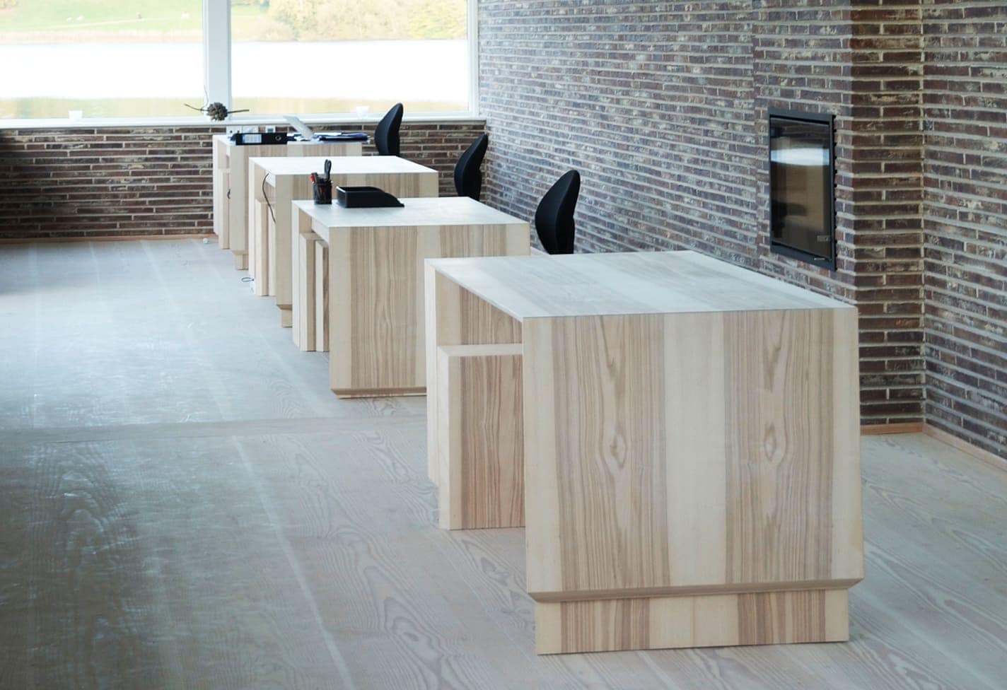 Vi fremstiller hæve-sænke-borde på mål med et enkelt og stringent udtryk, hvor kabler samt andet kontorudstyr skjules bag bordets gavle, hvilket skaber en rolig og ryddelig æstetik i rummet. Bordene snedkereres således, at der skabes gennemgående åretegninger i træet langs gavlene og bordpladen.