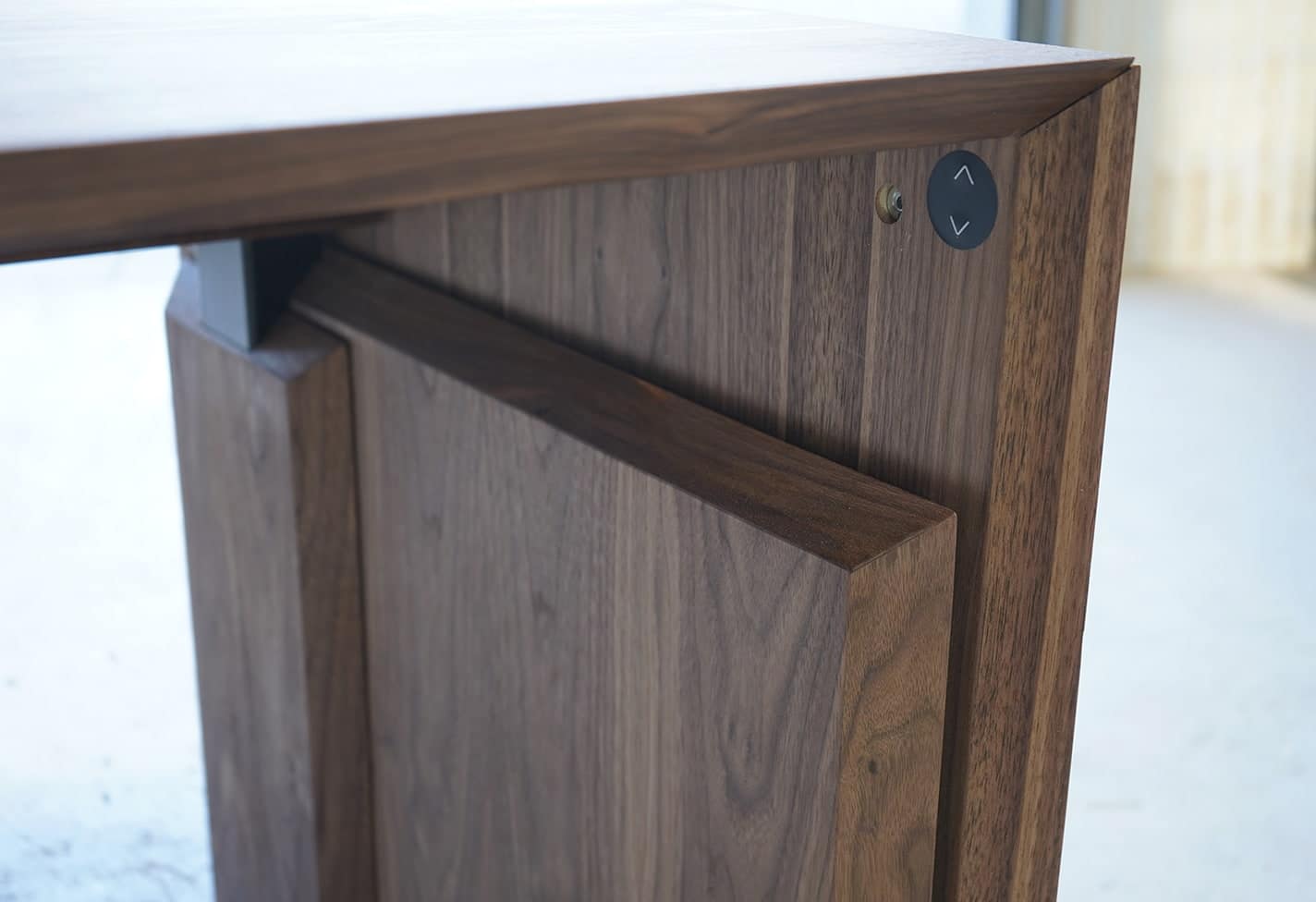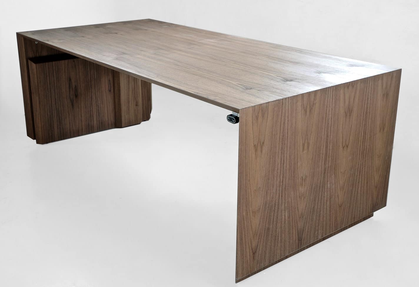Hæve-sænke-bord håndlavet på snedkeriet af høj kvalitet fra Jesper Holm Design København. Gennemgående åretegninger langs gavlene på skrivebordet