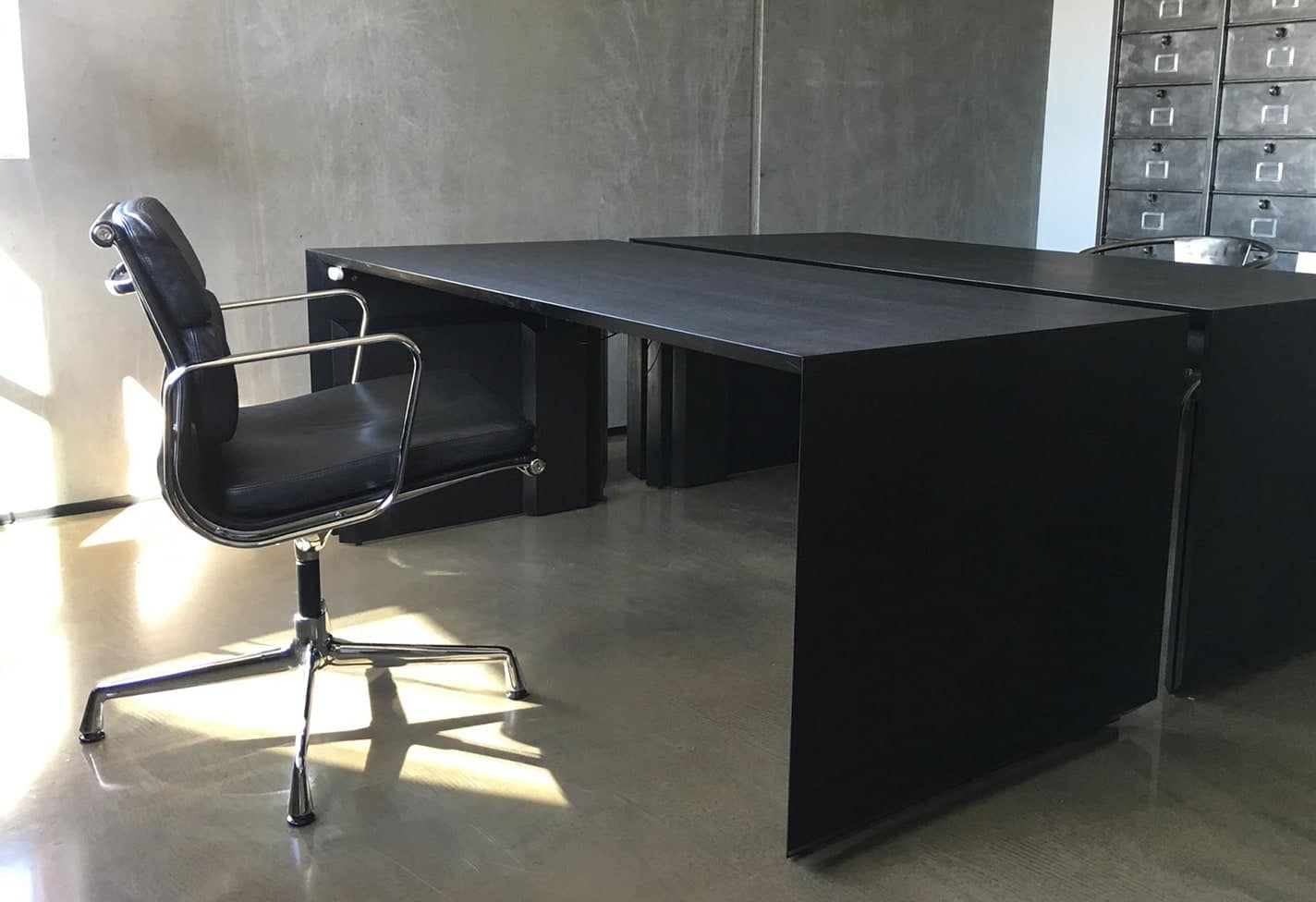 Et minimalistisk udtryk / Ønsker du et helt minimalistisk farvemæssigt udtryk, kan bordet også lakeres eller behandles med en farvet olie. Her ses en kunde, som har valgt at få et sort bord, som passer til den grå væg og den sorte kontorstol.