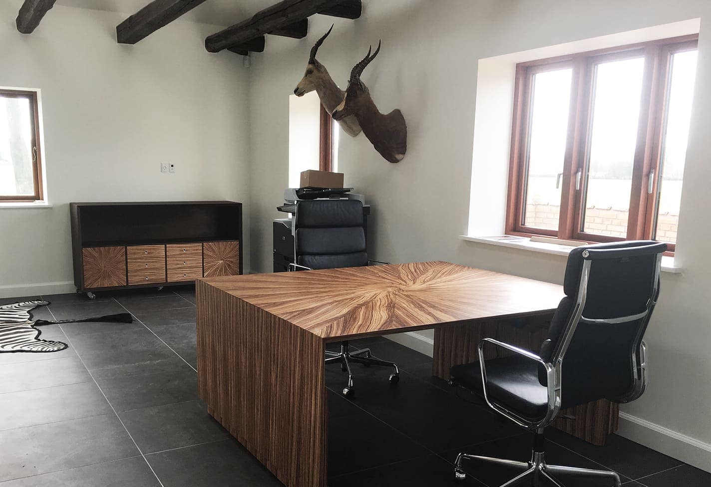 Skrivebord med matchende opbevaringsmøbler / Ønsker du et ekstra gennemført udtryk til dit kontor, kan der også fremstilles opbevaringsmøbler i samme træsort som skrivebordet. Her ses en kunde, som har valgt både skrivebord og Boox reoler med solskinsmønster til sit kontor.