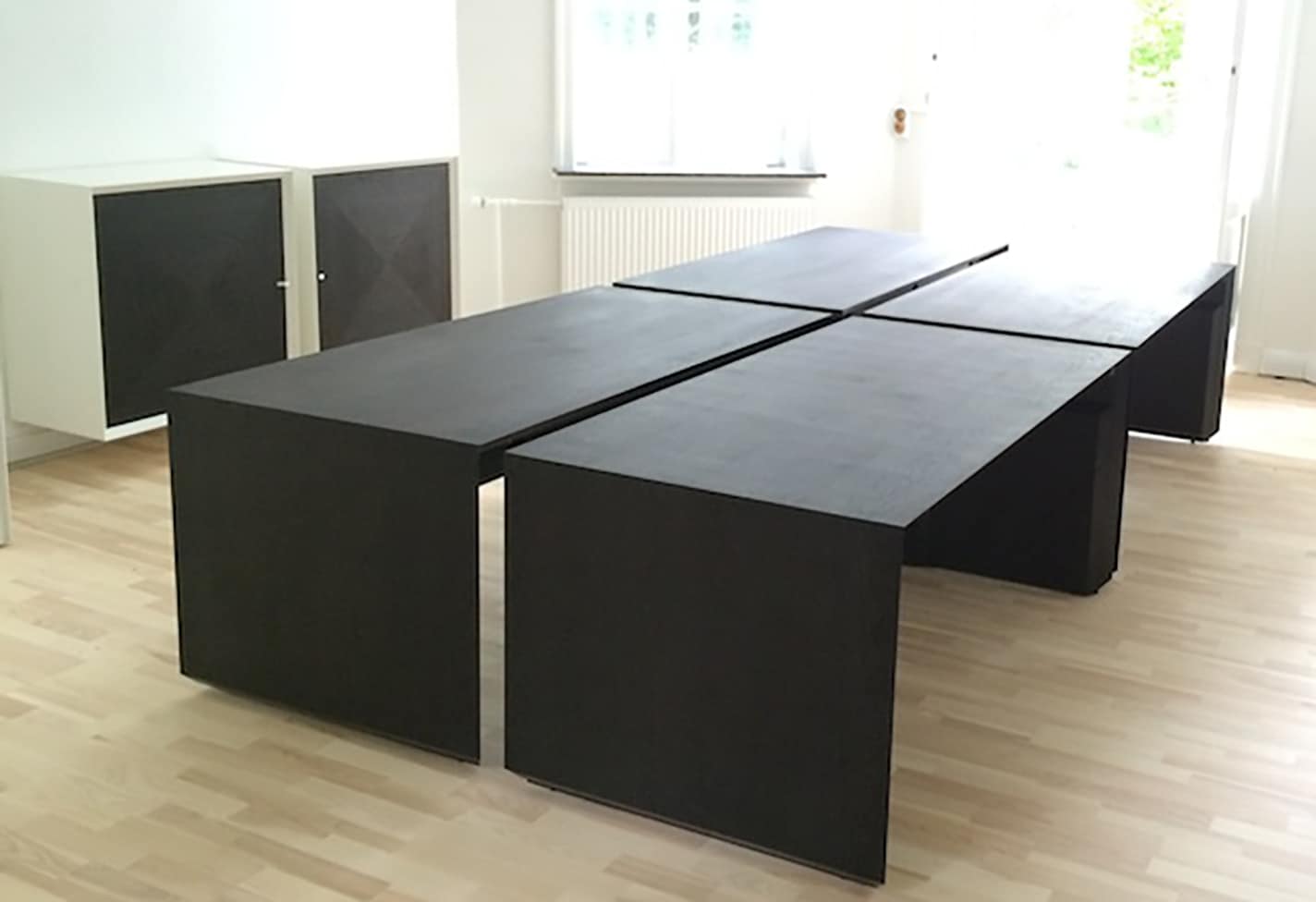 Alt fremstilles ud fra dine ønsker / Bordene kan fremstilles ekstra brede, så der er plads til en person på hver side. Dette bord er fremstillet med solskinsmønster af olieret zebranotræ.
